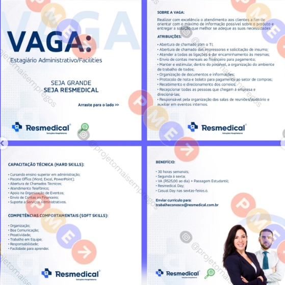 Vaga para Estagiário em Administrativo/Facilities em Resmedical em Recife e região neste sábado (26/07)