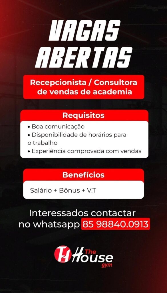 Vagas para Recepcionista/consultora de vendas de academia na The House Gym em Fortaleza e Região nesta quarta feira (16/07)